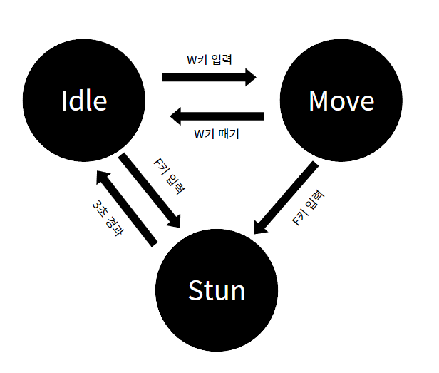 Idle 상태에서 W키를 누르면 Move상태로 전이되어 움직이고 F키를 누르면 Stun상태로 전이 되는것을 확인할 수 있다.