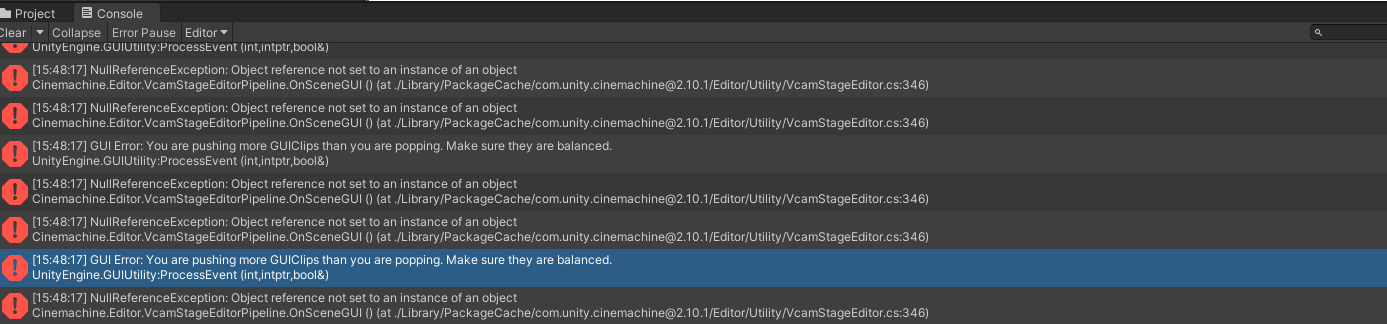 유니티에서 영상 연출 효과를 위해 시네머신을 설치하고 가상 카메라를 생성하면 이러한 오류가 계속 떴다. 더블 클릭해서 들어가보면 유니티 내부 코드 버그가 발생하고 있는걸 확인할 수 있었다. 유니티 코드를 수정하기에는 좀 그래서 방법을 찾아보았다.