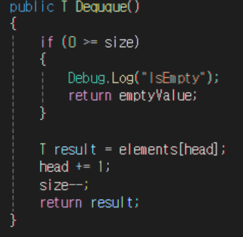 그게 아니라면 elements의 첫번째 항목을 가져오고 elements를 지우면 메모리 할당이 일어나므로 head를 증가함으로써 기존 메모리에 접근을 제어한다.