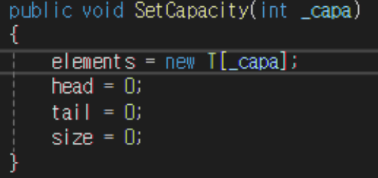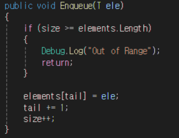 미리 공간을 할당하고 tail이 elements의 길이보다 크면 메모리 초과가 된것이므로 리턴을 하고 그게 아니라면 값을 추가하고 tail값을 1 증가시킨다.