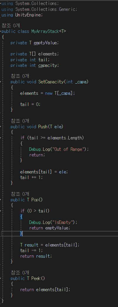 tail이 0보다 작으면 스택이 비어있는 것이다. 스택의 마지막 항목을 가져오고 tail값을 1 감소시킨다. 스택은 후입선출이므로 늦게 들어온 값이 먼저 나간다. 따라서 tail에 있는 항목이 리턴되고 그 다음으로 늦게 들어온 항목이 tail이 된다.