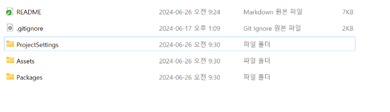 자신이 만들었던 프로젝트 폴더에 가서 Assets,Package,ProjectSetting을 깃 폴더에 복사한다. 마찬가지로 다운로드 받은 gitignore또한 넣어준다.