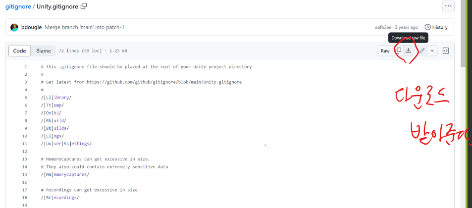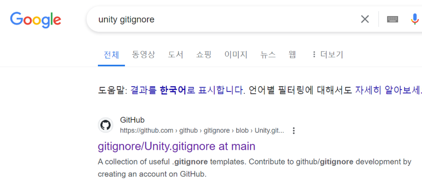 구글에 unity gitignore을 검색해서 파일을 다운로드 받아준다.