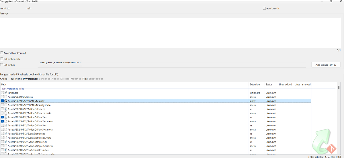 해당 창이 뜰텐데 전체를 올리고 싶으면 crtl + a 누르고 체크박스를 클릭한다. 아니면 자신이 따로 올릴 파일들을 선택한다. 그 후 git commit to message에 내가 작업한 내용을 기술한다. commit을 눌러준다.