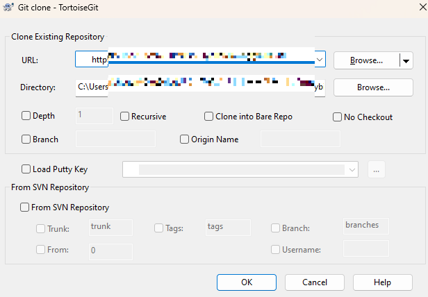 다음은 맨 위 과정과 똑같다. Git Clone을 누르고 URL을 붙여넣기, 경로를 지정하면 해당 경로에 파일이 생긴다.
