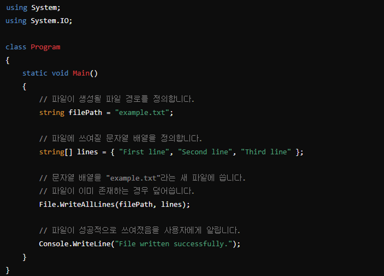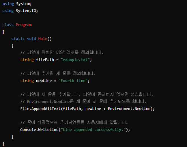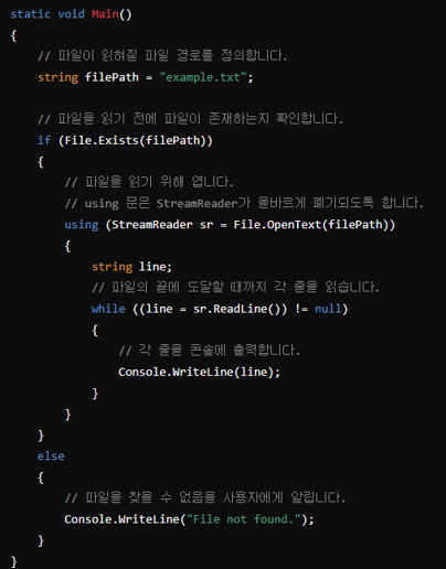 - string filePath = "C:\\example.txt"; \를 사용하여 경로를 지정할 경우 이스케이프 문자로 인식되므로 \\로 써야한다.